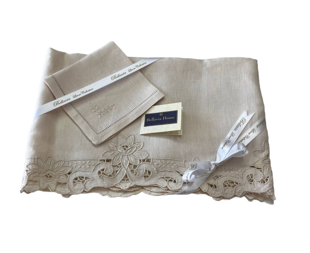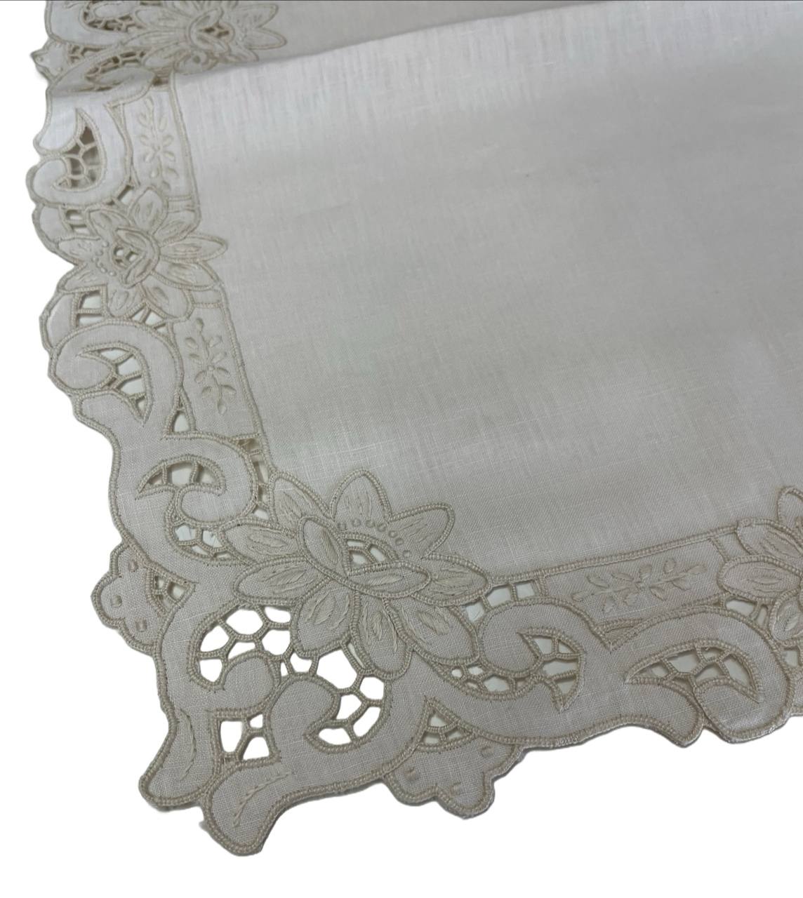 Tovaglietta da té art. NB1313TT 100% lino ecrù ricamo intaglio