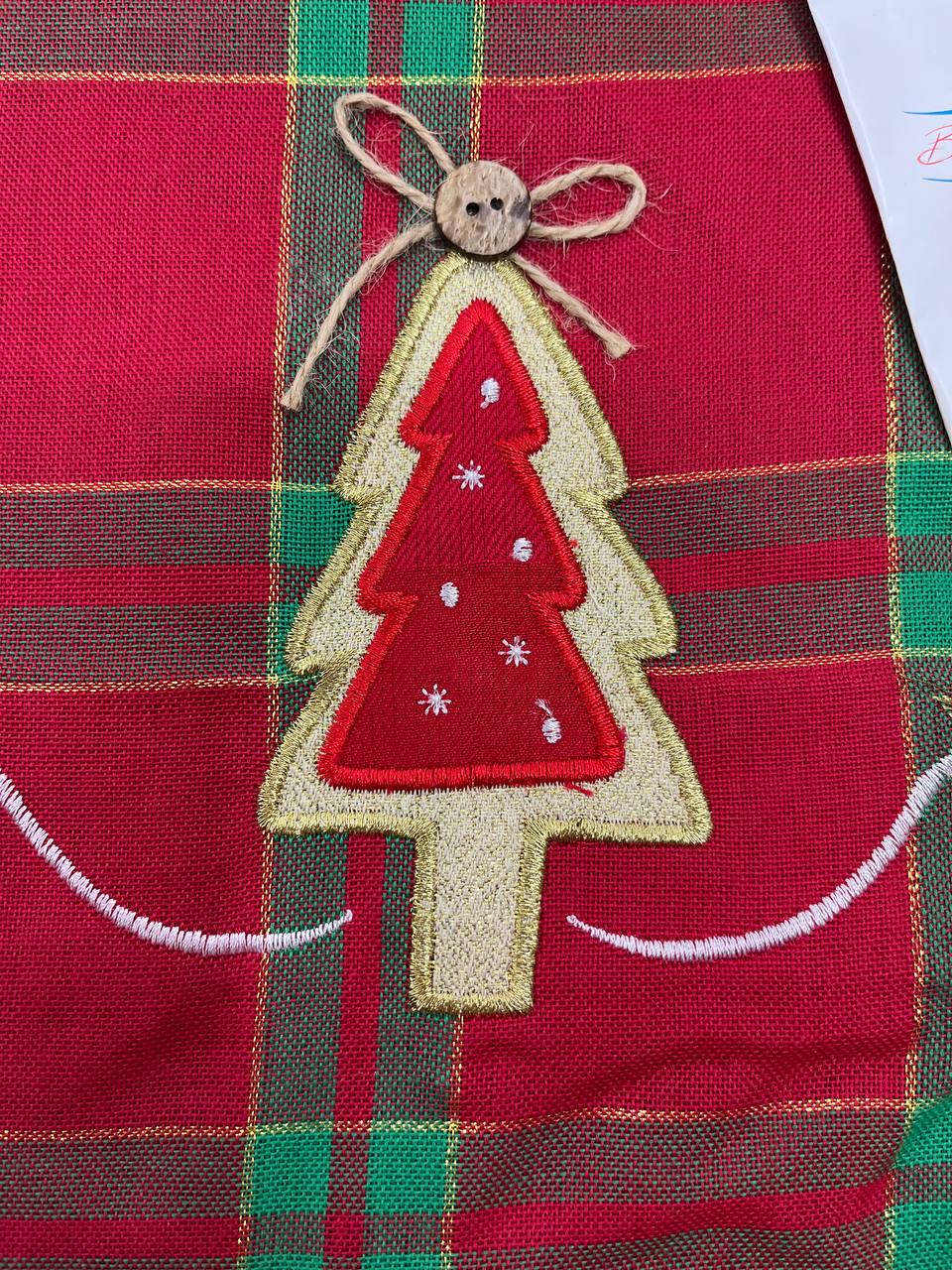 - Fantasia Scozzese con ricamo albero di Natale con bottone applicato
