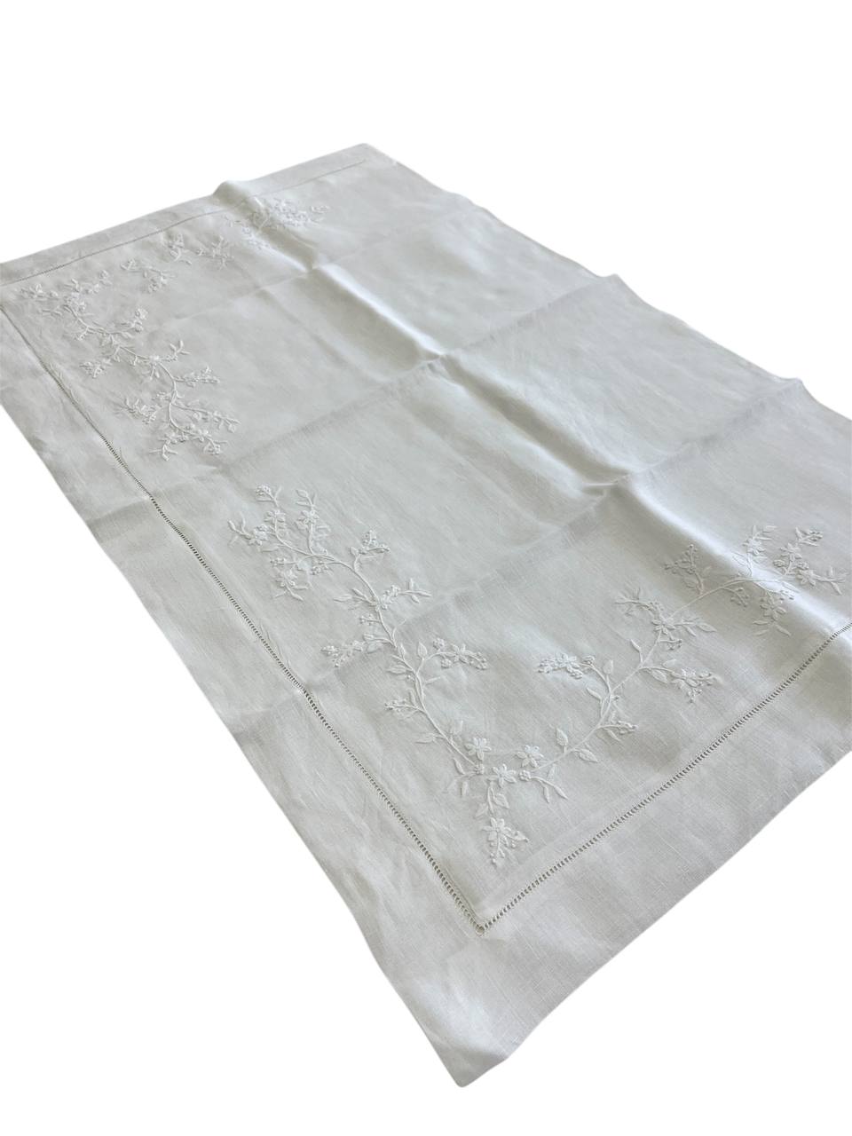 Lenzuola matrimoniale Ricamo Bianco Emozioni Italiane, in lino ricamato con una diramazione di fiorellini nella balza del lenzuolo e nelle federe.