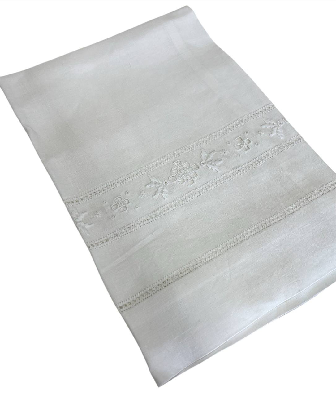 Coppia asciugamani (1+1) in lino Punto antico Fiore Emozioni Italiane, la freschezza del lino incontrano la bellezza del ricamo con punto antico e gigliuccio, per un bagno sempre fine ed elegante.