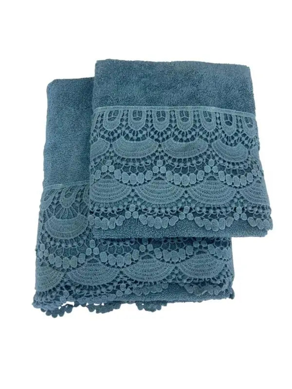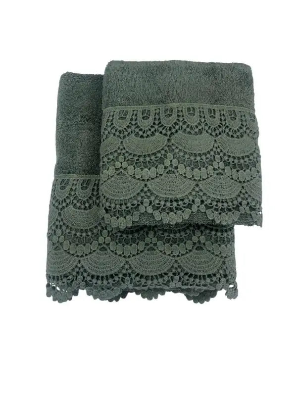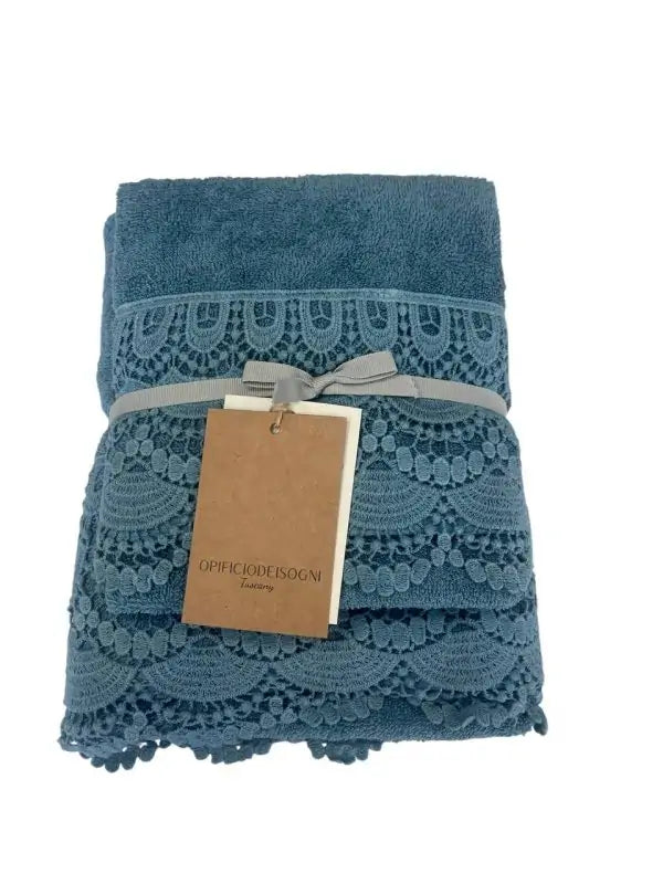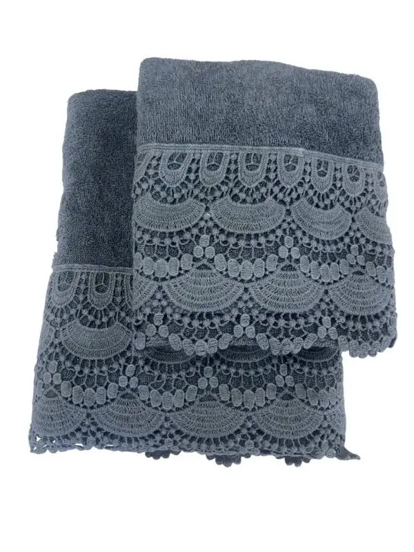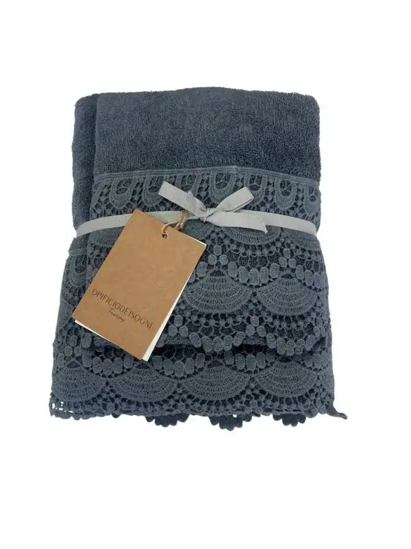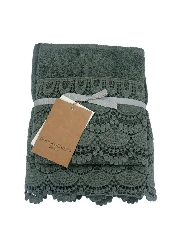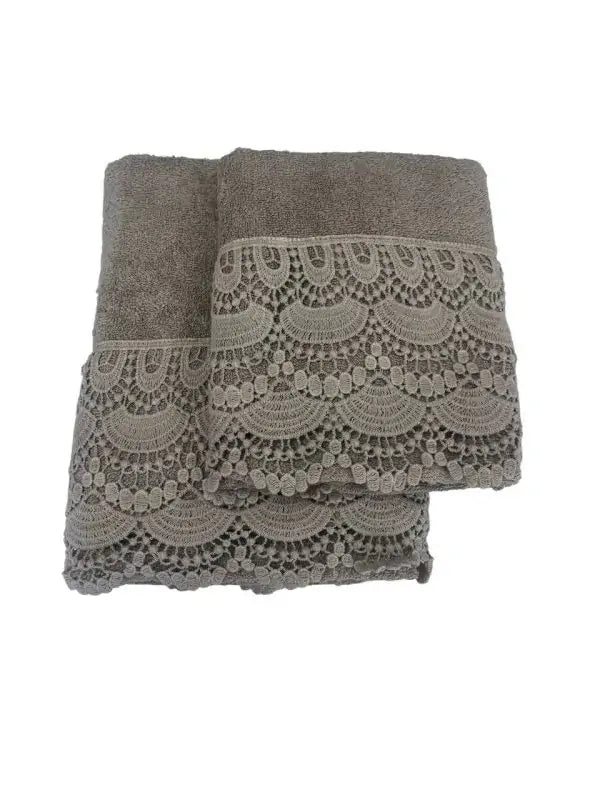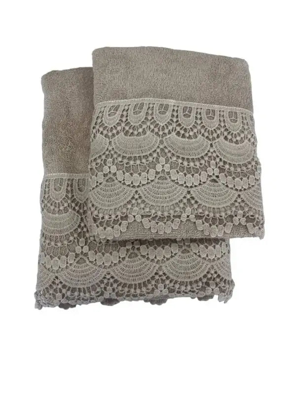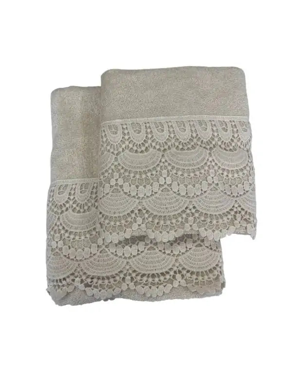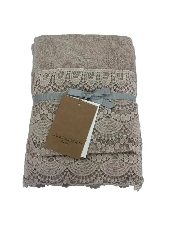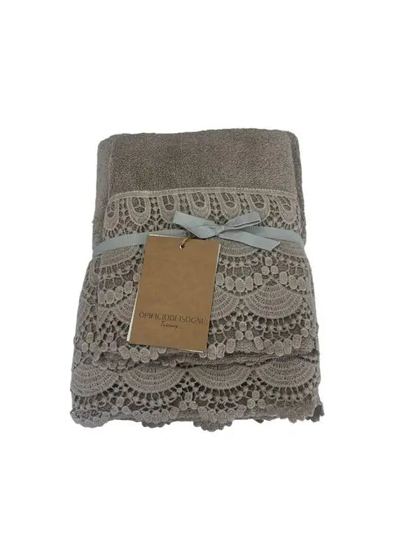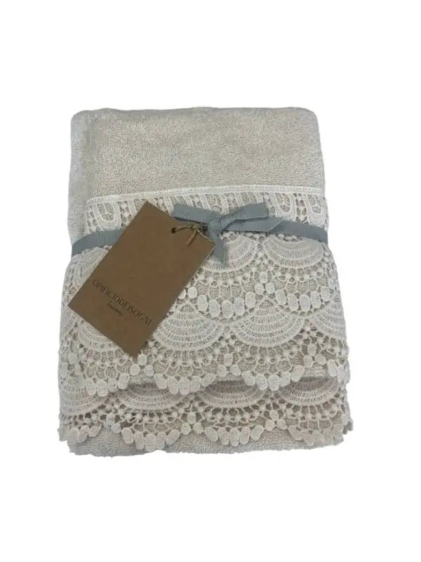 Opificio dei sogni Coppia asciugamani (1+1) Corsetto, in spugna, balza con pizzo di macramè, realizzata in spugna di cotone 100%, tessuto morbido, assorbe, resistente a più lavaggi. Colori neutri e facilmente abbinabili.