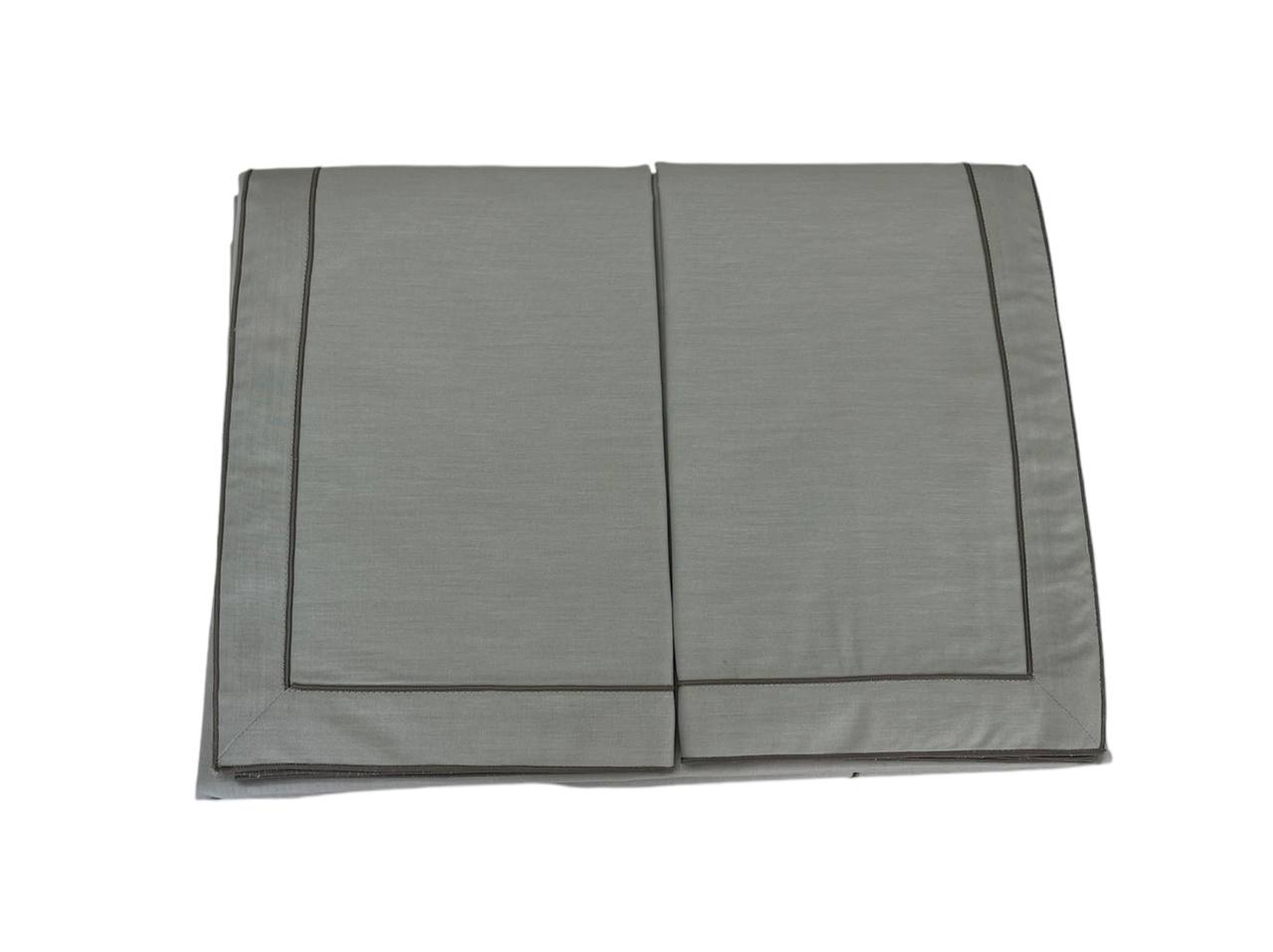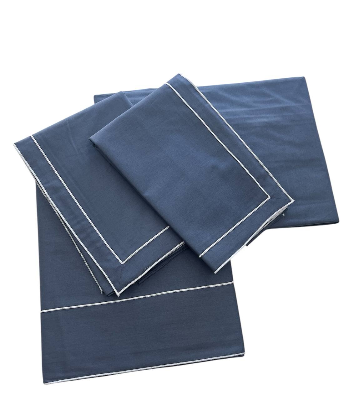 Completo lenzuola matrimoniale Milo Riviera, con bordino sia sulla balza del lenzuolo che sulle federe per rendere ancora più particolare il tuo letto. Il tessuto in cotone madapolam una vera coccola per la pelle.