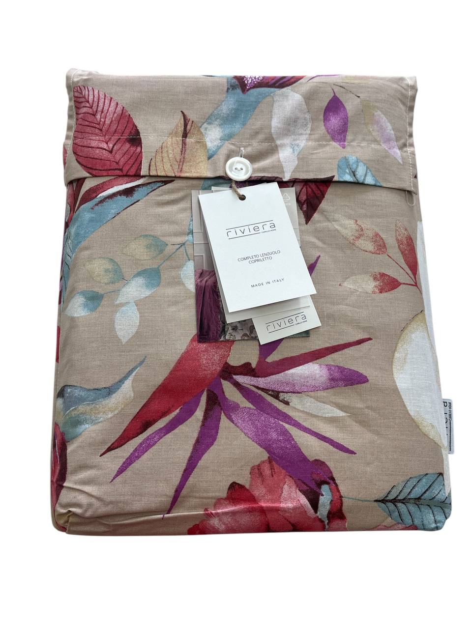 Completo lenzuolo copriletto 1 piazza e mezza Hibis Riviera, per un letto super colorato, la balza applicata ti permette di utilizzarlo in estate senza copriletto, confezionato in pratico sacchetto di tessuto riutilizzabile.